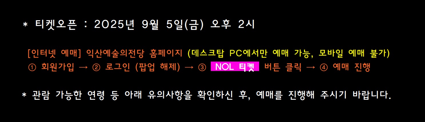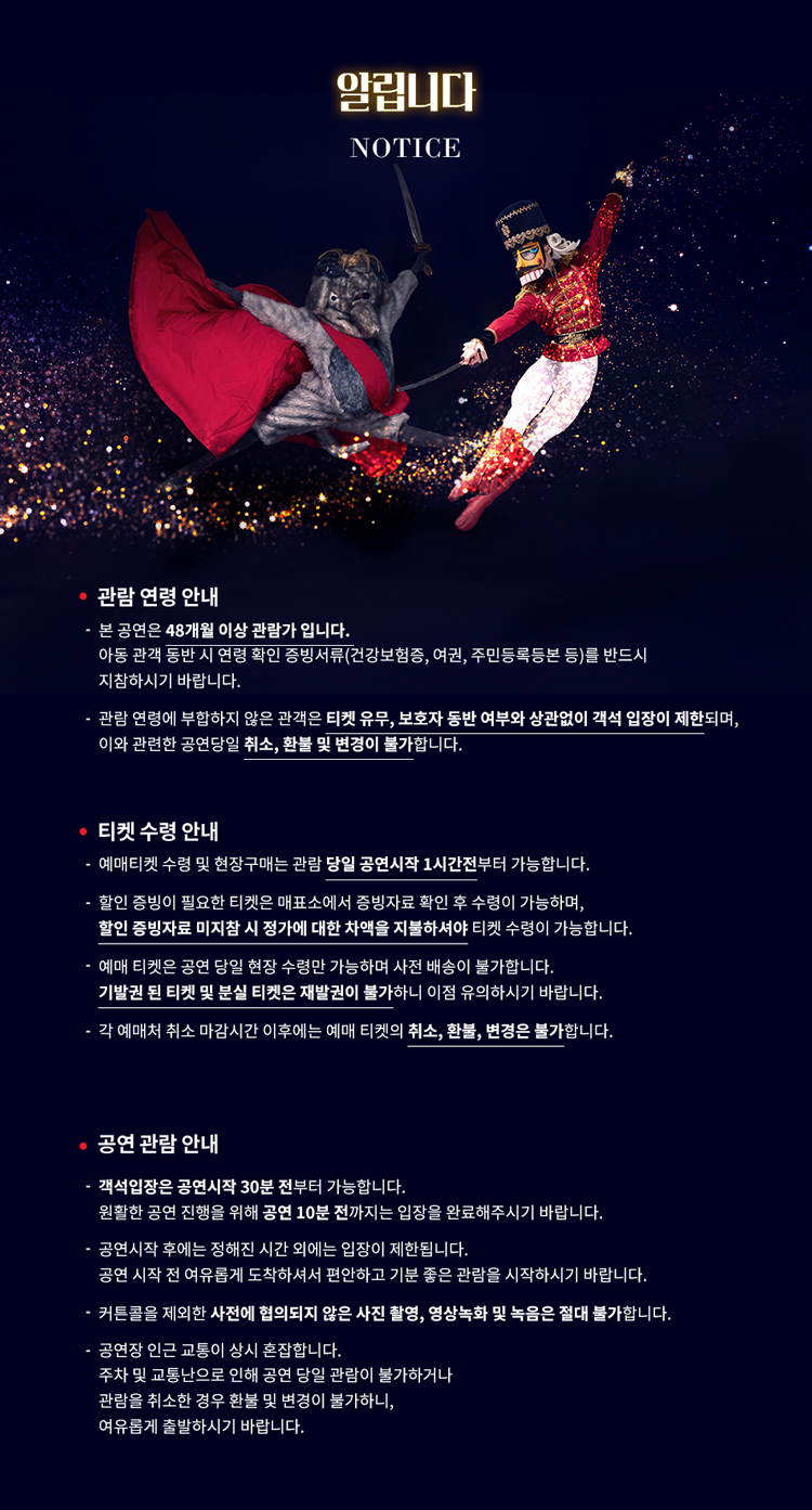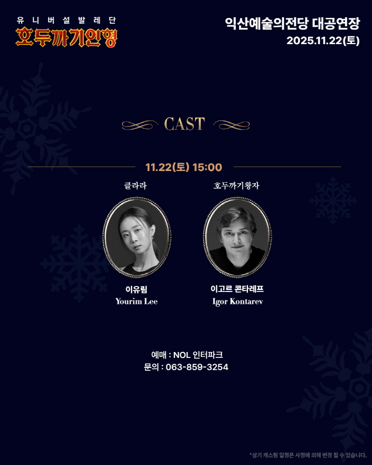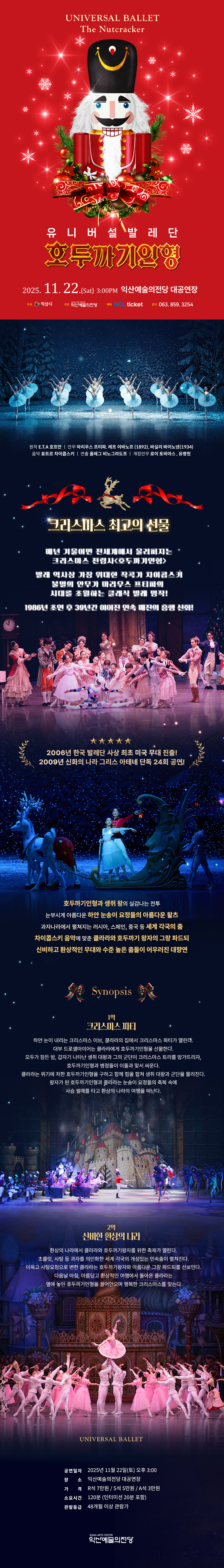 모바일 공연일정 [기획] 유니버설발레단 <호두까기인형> 기 간 : 2025-11-22~2025-11-22 시 간 : 오후 3시 장 소 : 익산예술의전당 대공연장 관람료 : R석 7만원, S석 5만원, A석 3만원, 2층석 2만원 주 최 : 익산시 문의전화 : 063-859-3254